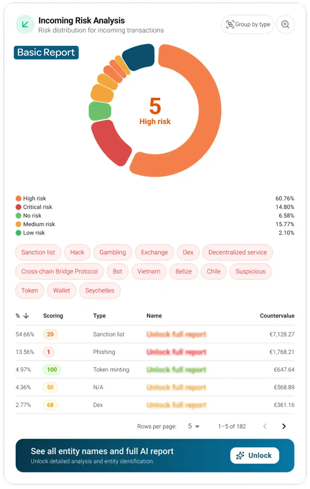 Your Basic Report (1 credit) shows how your address interacts with incoming and outgoing counterparty types only (47+ types such as exchanges, mixers, scams, lenders, etc.). It also includes a short AI summary.
