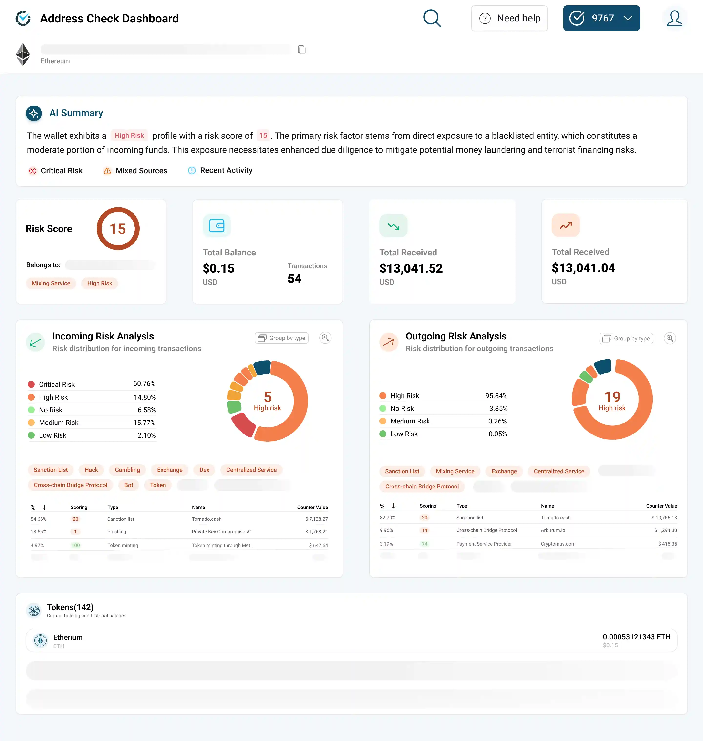 Scan counterparties across 47 risk categories and over 1 million identified entities. Every bundle includes asset risk scoring and exposure calculation.